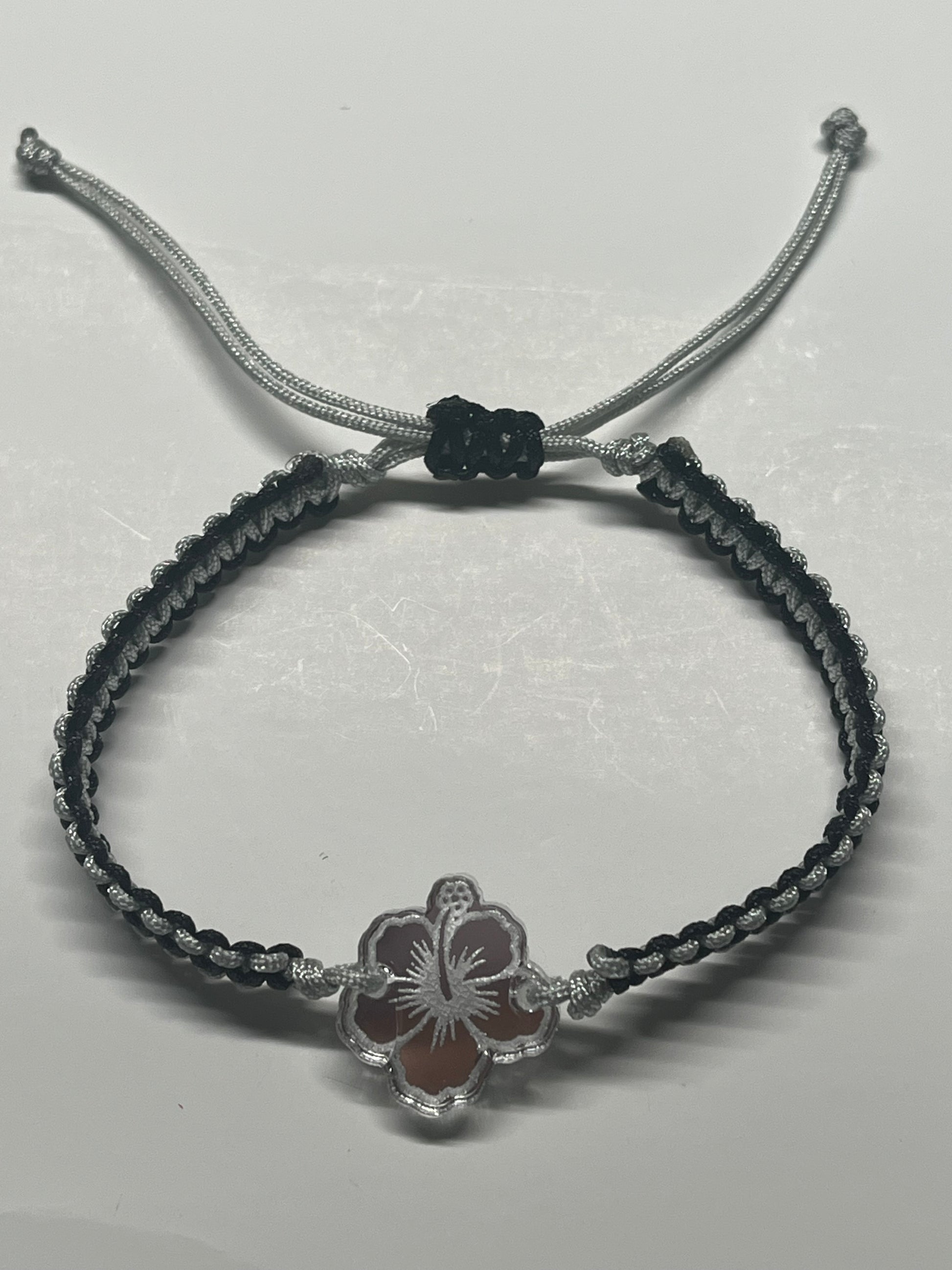 Black and silver nylon cord with acrilic silver flower connector adjustable.